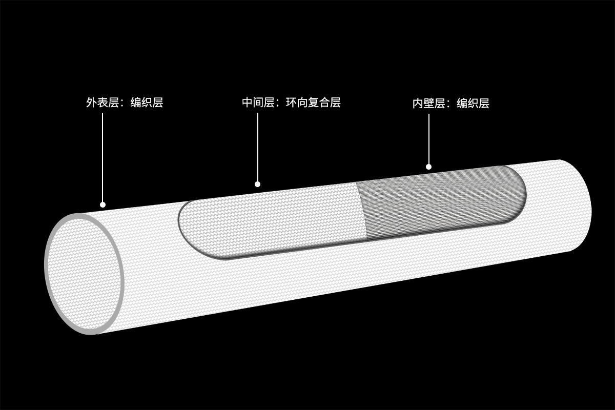 公司嚴格按照國家行業標準DL/T 802.2-2017要求:BWFRP管道以高性能無堿纖維為增強材料,聚酯樹脂為基材和阻燃助劑等為原材料,采用編織拉擠工藝,通過精密編織、編繞和拉擠工藝成型。產品由編織層、中間層、外表層構成。